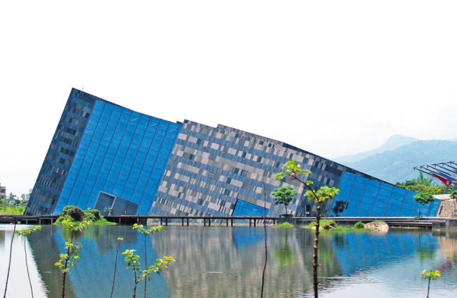 建築外觀如同傾斜的岩層,與周圍自然景觀融合